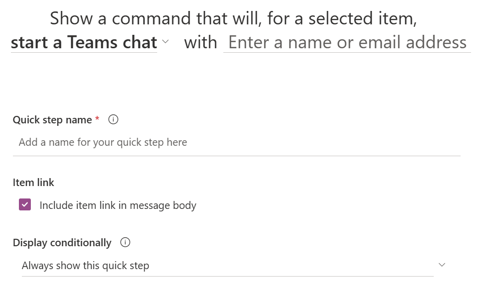 Opens a new Teams chat with one or more people from the list item. If the item contains people‑type fields, those are automatically suggested.